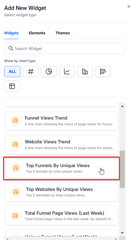 Section titled “Step 2: Add a Top Funnel by Unique Views Widget”- Start Adding a New Widget: