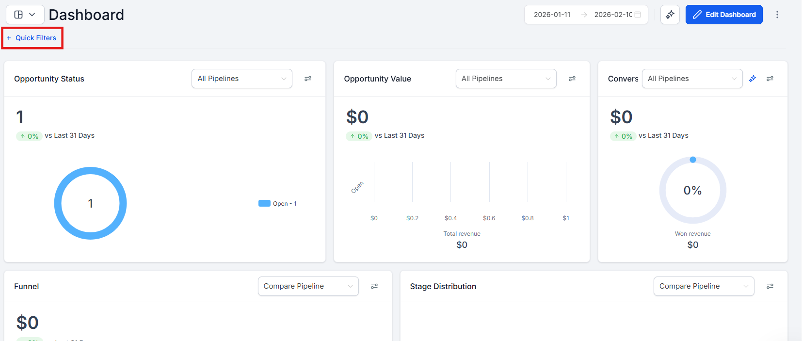 Section titled “Step 2: Access the Quick Filters Menu”Click on the Quick Filters button at the top of the dashboard.
