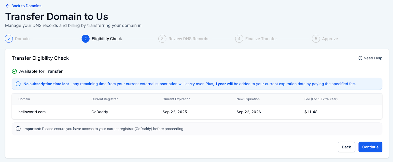 Answer: Yes! When you pay the transfer fee, it typically includes a one-year extension on your domain’s current expiration date, ensuring you don’t lose any time you’ve already paid for.