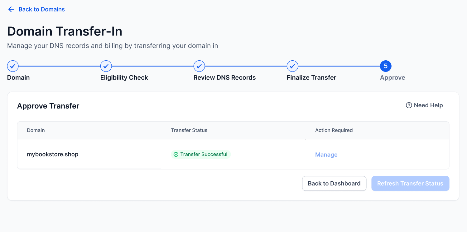 Section titled “Moving Your Domain to”When you “Transfer In” a domain, you are moving the management of that domain from another provider to our platform. Think of it as moving your home’s deed to a new filing cabinet where it’s easier to access.