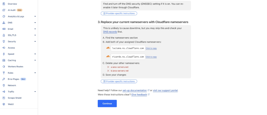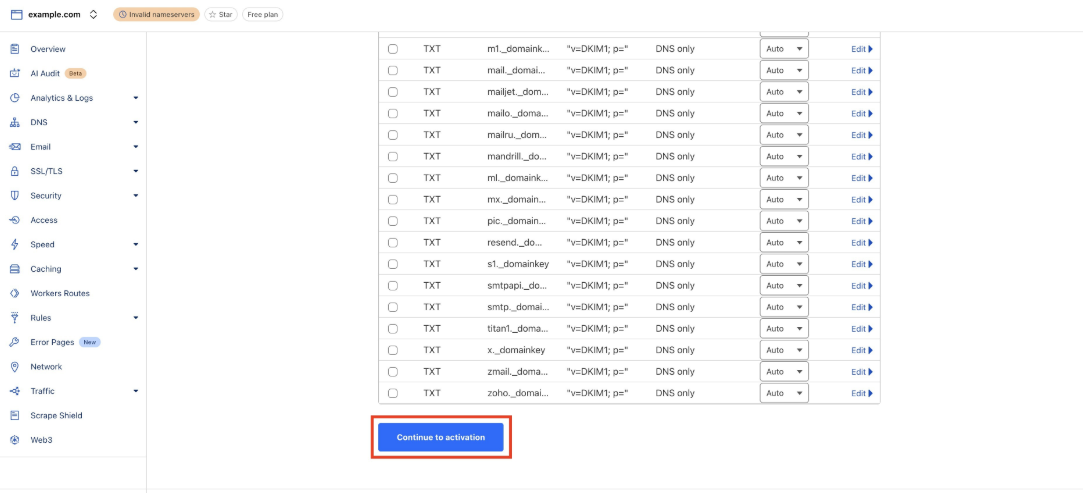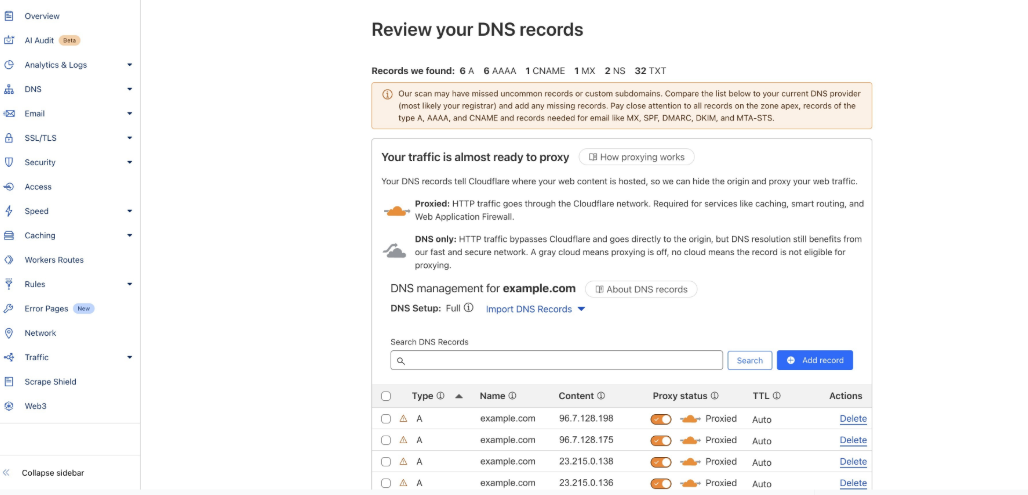 Note: Ensure that proxy or traffic-routing features are turned off for all DNS records during this stage.