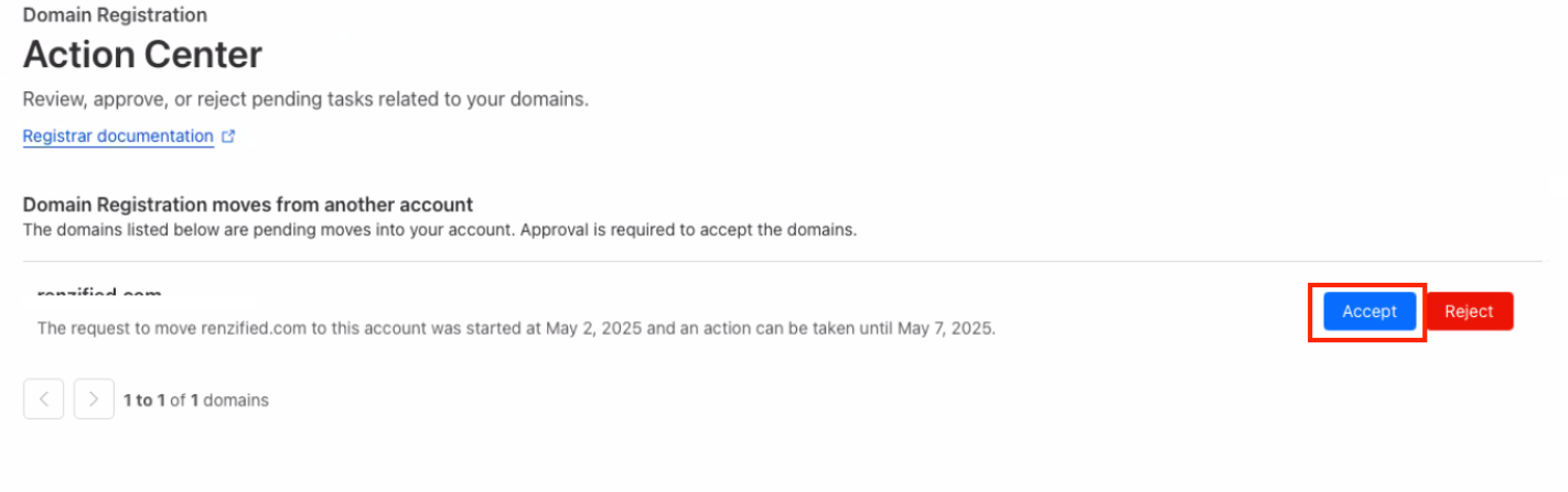 When finished, the domain status updates to Active in the destination account.