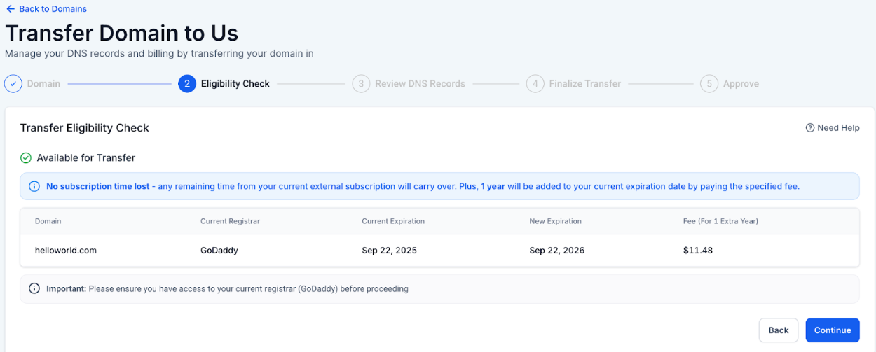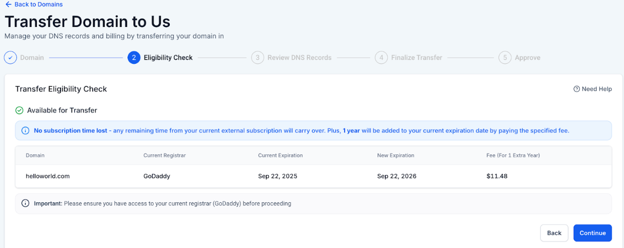 - Eligibility Check - Confirm the domain qualifies for transfer.