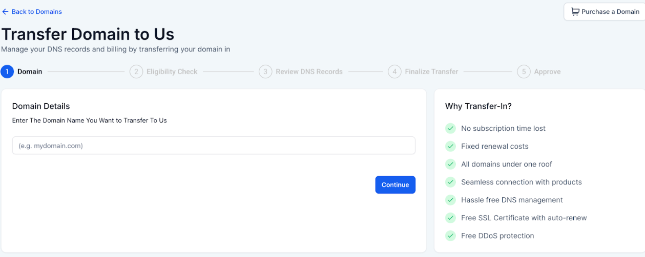 Section titled “Domain Transfer Process Overview”- Enter Domain - Input the domain you want to transfer.