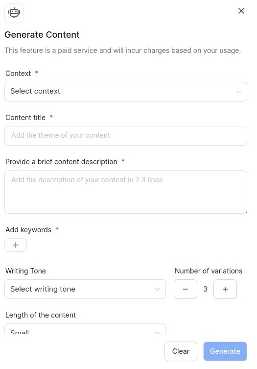 - Click on the Generate AI button and fill out the Generate Content form.