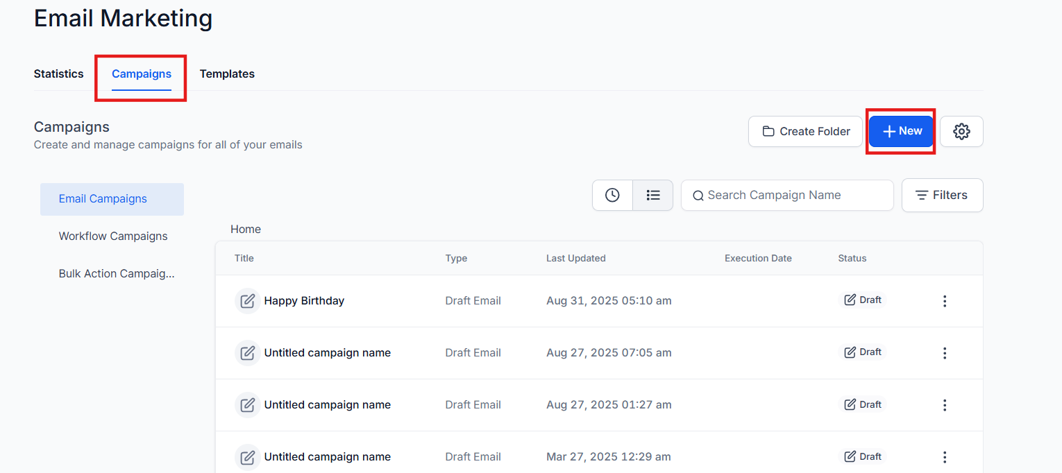 Section titled “Where to find the Content AI inside the Email Builder”- Go to Marketing> Emails > Campaigns >Create Campaign or Edit an existing campaign.