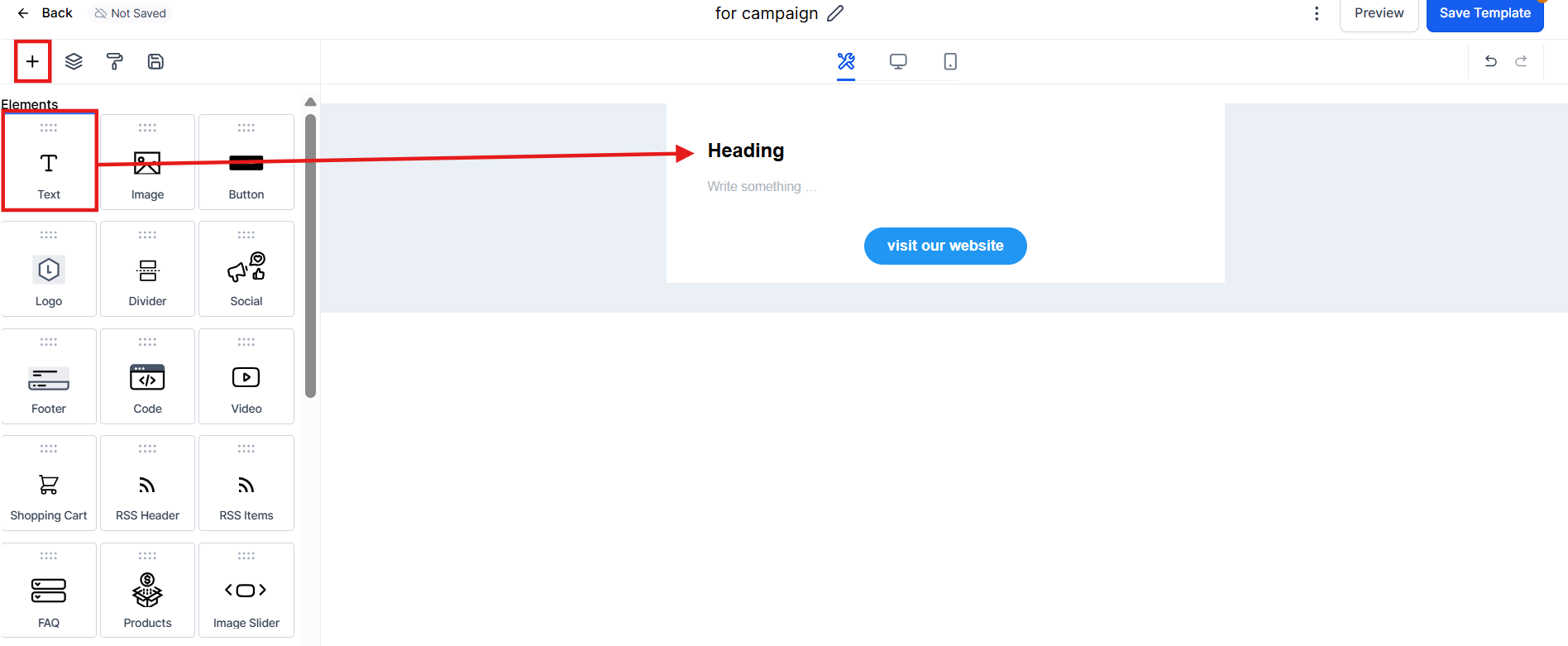 - Inside the Email Builder, You can drag and drop a new Text element or edit an existing One.