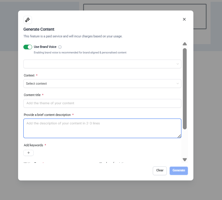 Brand Voice Selector Dropdown: Choose your preferred Brand Voice from saved options, with your default pre-selected.