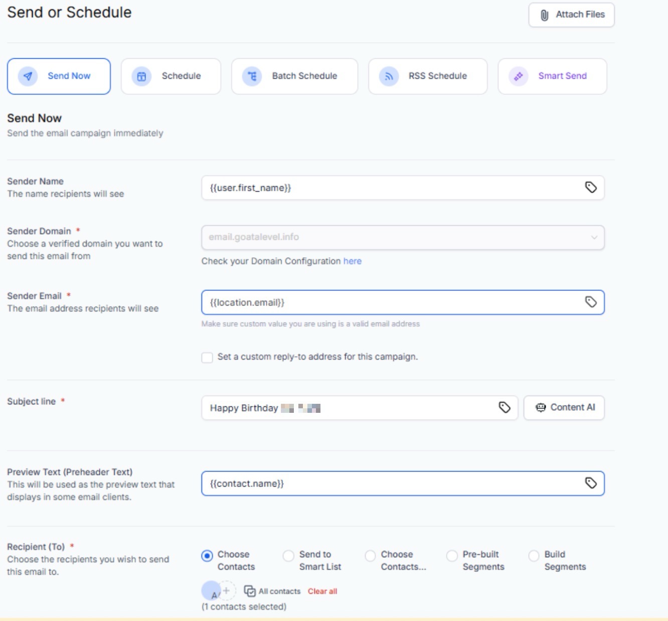 Section titled “Using Content AI for the Subject Line”- Once the email campaign content is created, content AI will be available in the subject line, too. Click on the send and schedule screen.