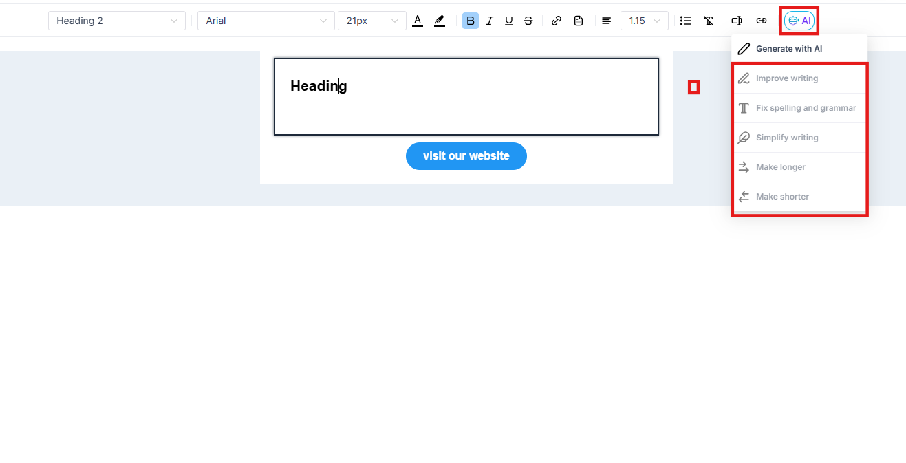 Section titled “How to Use the Content AI Feature to Edit Text”- To edit a text you already have, highlight the text, click on the content AI button, and you will see the options.