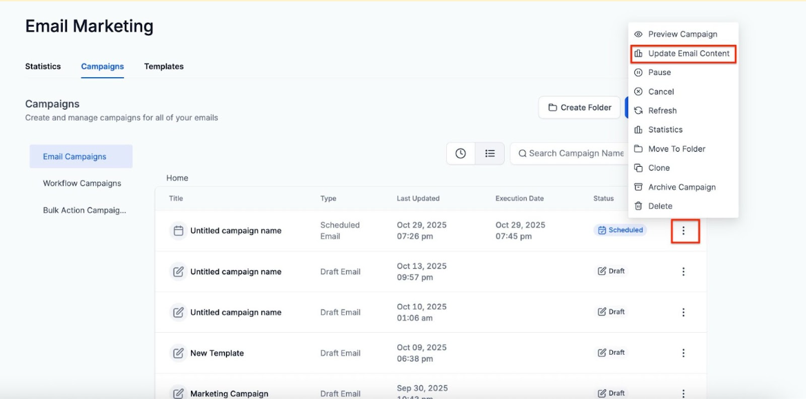 Section titled “Step 1: ”- Click on the three dots next to the campaign and select “Update Email Content”