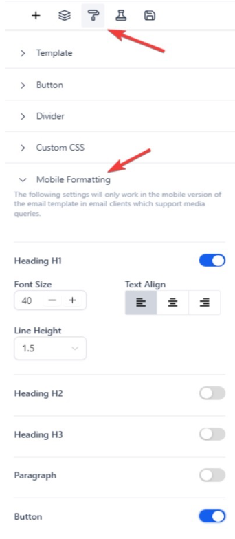 - Add mobile formatting for different font styles with size, alignment, and line spacing. These settings will only work in the mobile version of the email template in email clients that support media queries.