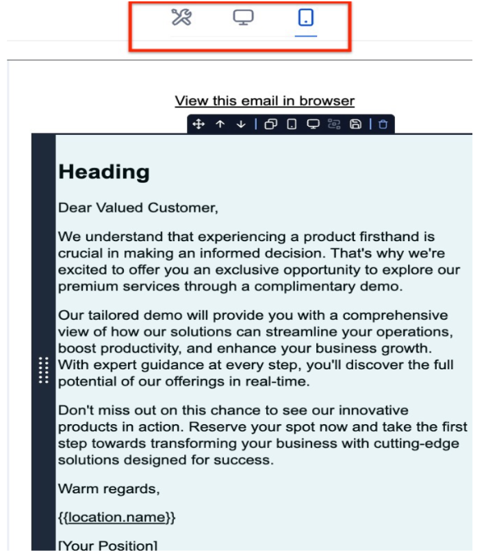 Using the Email builder, you can format emails for mobile devices. Optimizing the mobile view of an email is critical to ensure it works well on a mobile device, which is how many people will view your email.