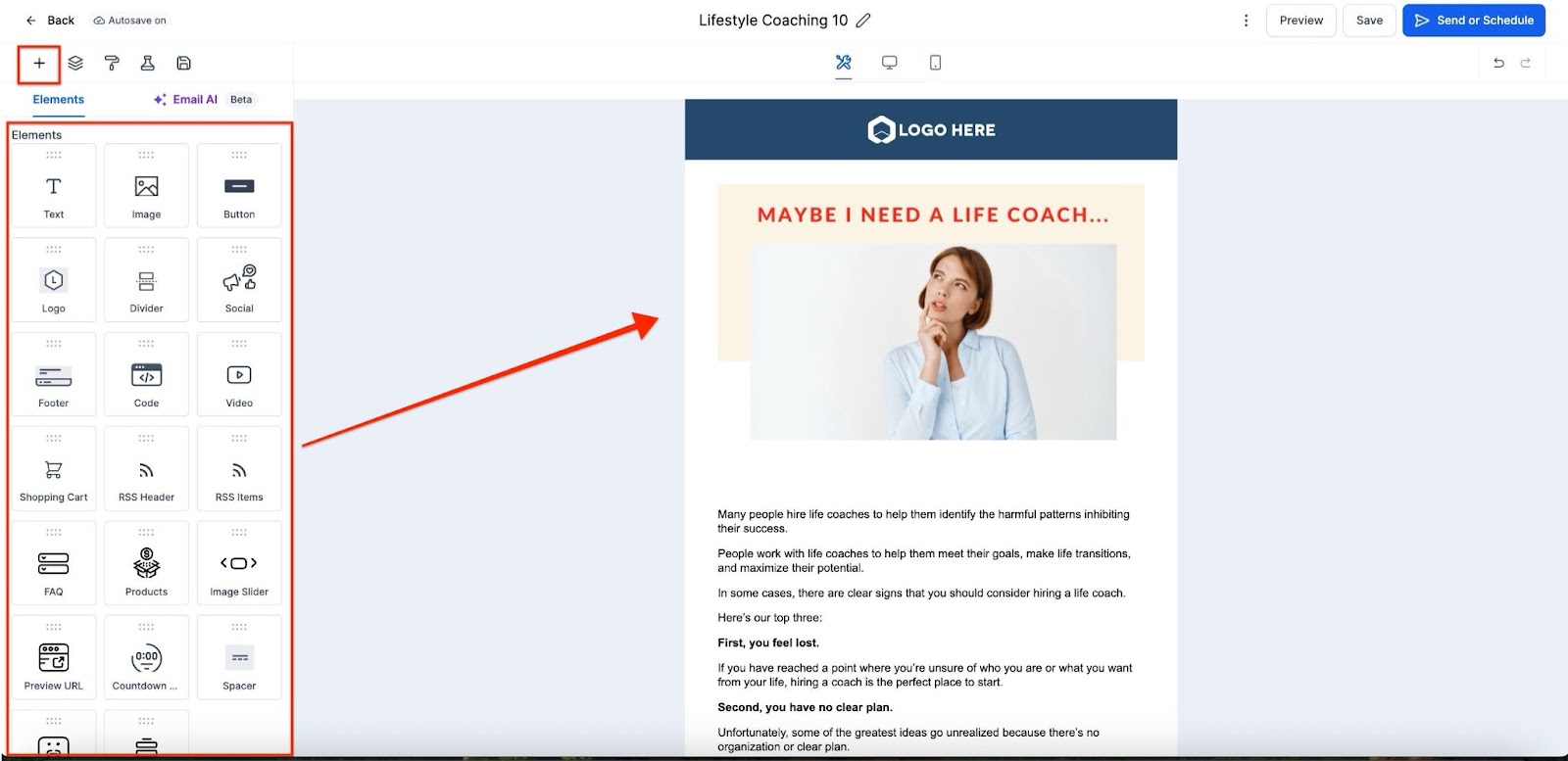 - Design your email and content by adding all the necessary elements.