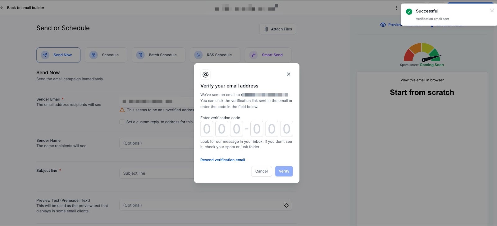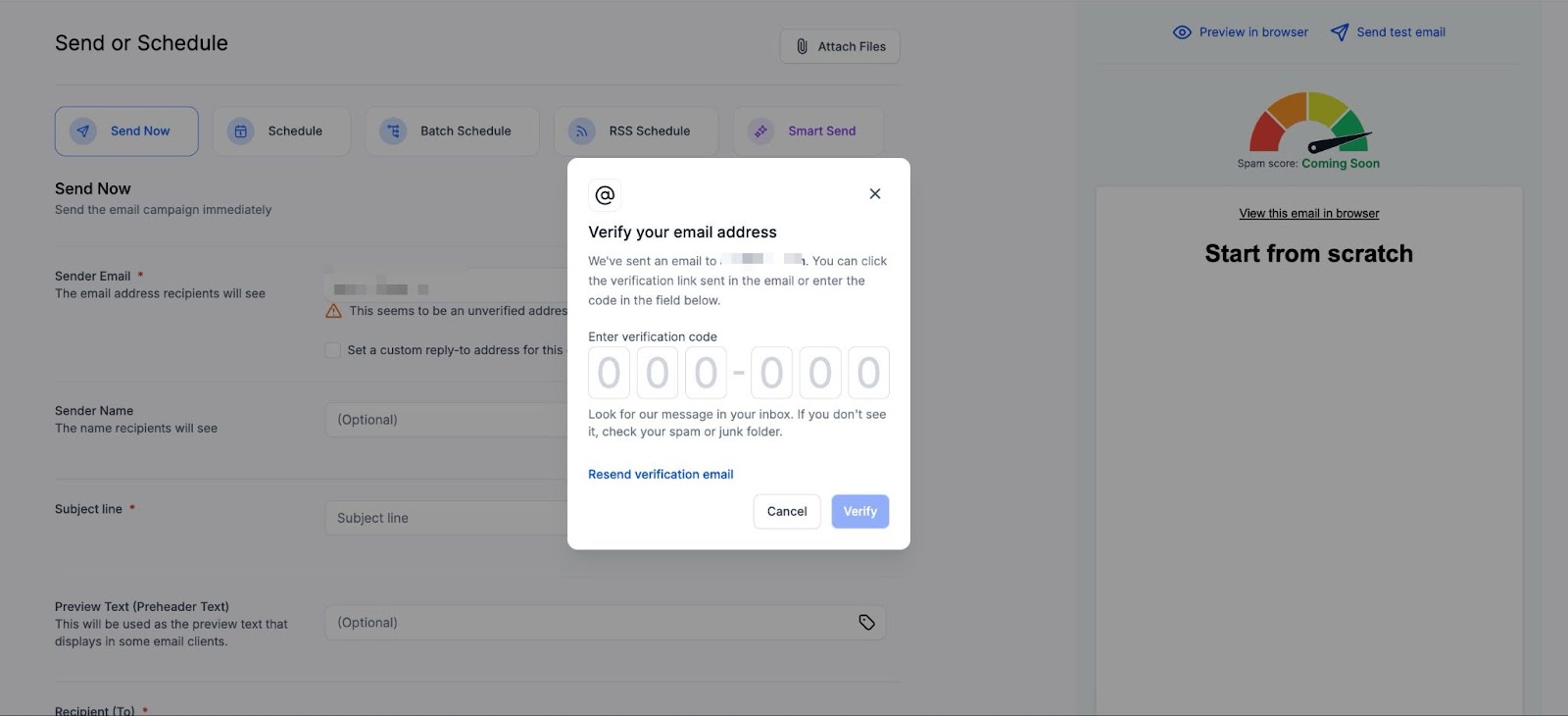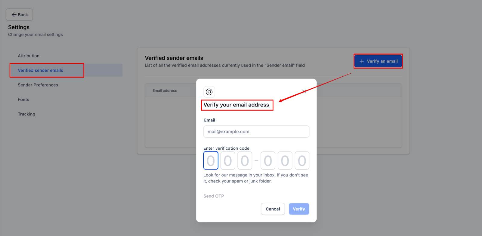 Section titled “How to Verify Your ‘From’ Email Address to Avoid Being Sent to Spam”Verifying emails before sending campaigns helps prevent identity spoofing and ensures your messages reach the intended recipients. To use this feature, follow these steps: