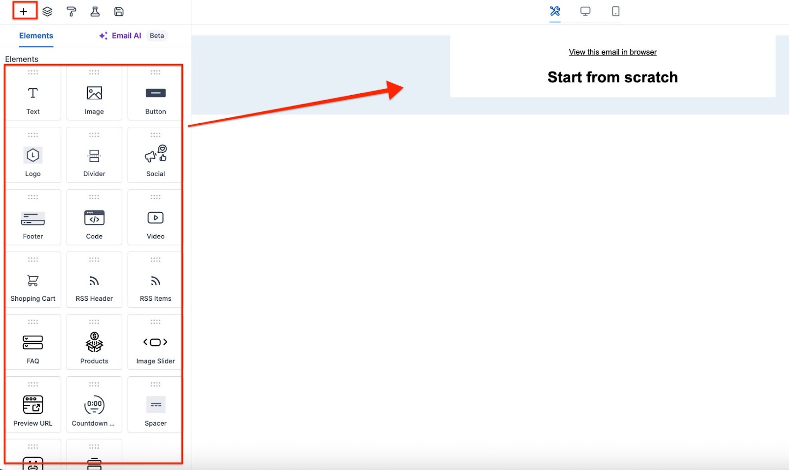Section titled “Part 2: Customize your email”- Drag and drop your desired elements into the builder area.
