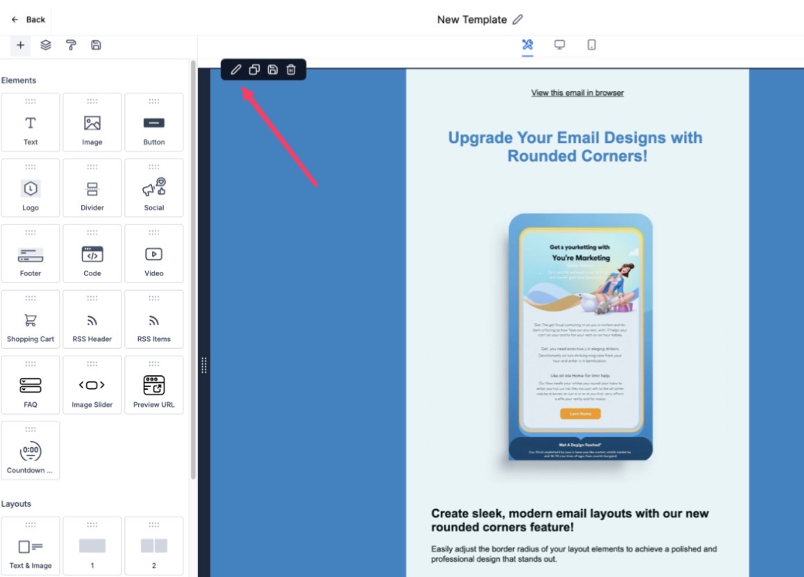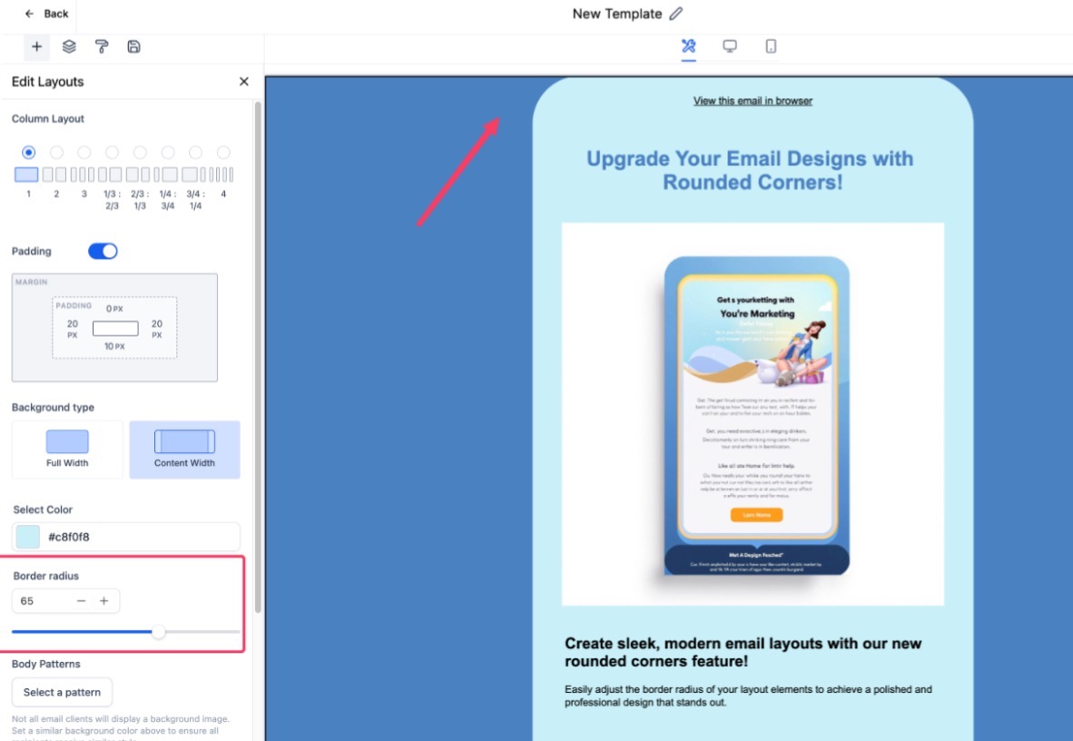 - The layout rounding feature allows you to enhance the aesthetics of your email designs by adjusting the corner radius of elements. Select the layout element, and adjust the corner radius using the slider.
