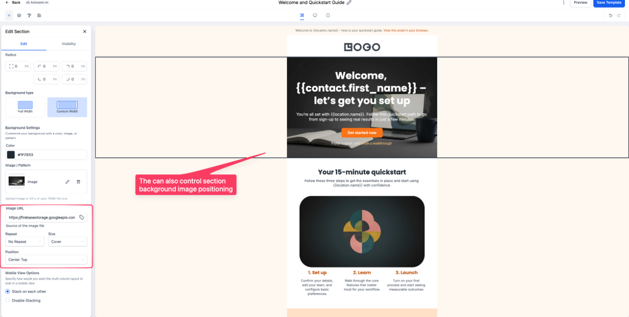 Section Background Images: You can apply and control background images directly within individual sections for greater visual depth.