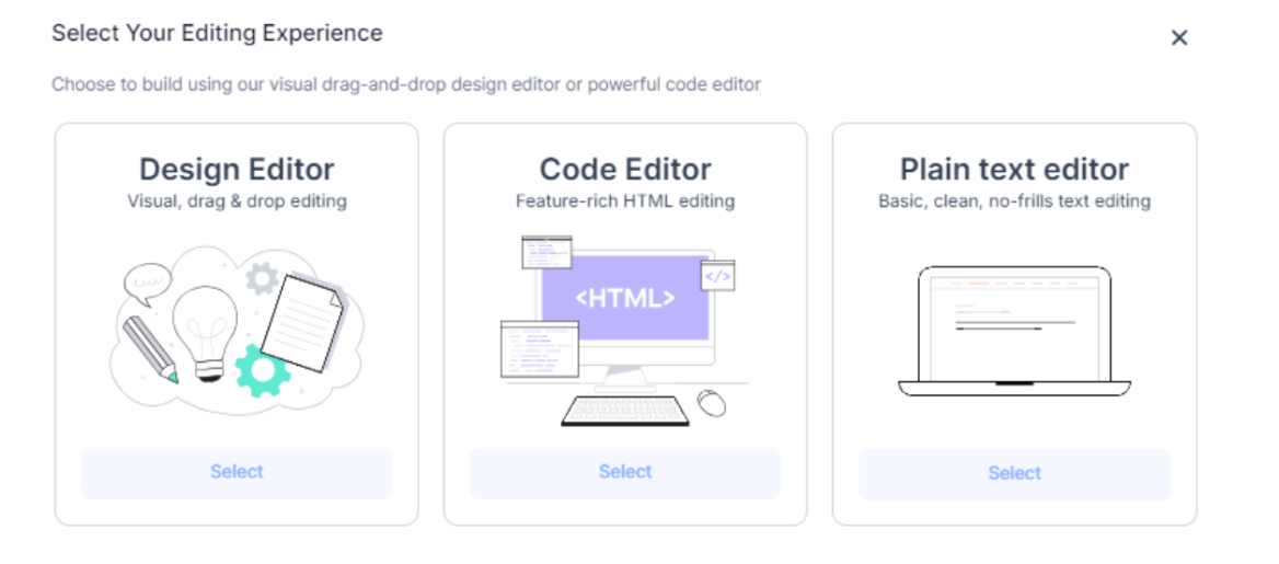NOTE: The plain text editor offers a basic, clean, and no-frills approach to text editing, making it ideal for simple, straightforward content creation. Design Editor has a drag and drop elements, while Code Editor refers to HTML