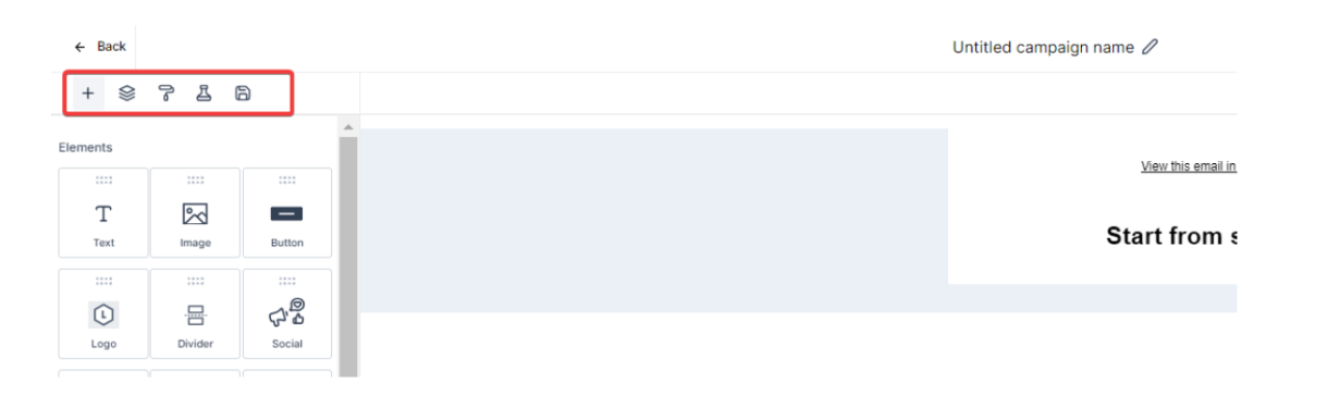 - Manage Elements: The Manage Elements icon provides an overview of all the elements within your email. Scrolling through the list of sections lets you see what elements it contains.