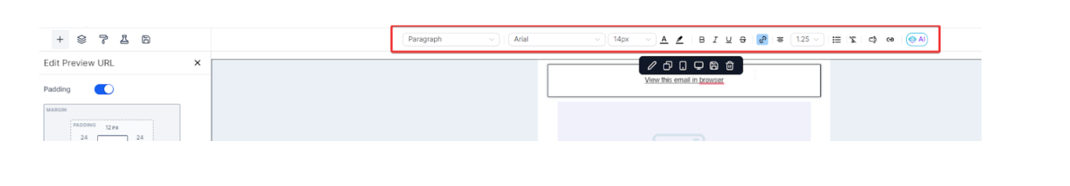 Section titled “Part 3: In-Line Editor”When you select an element for editing, an inline editor will appear on the top. This editor gives you extensive text formatting options. It is a powerful tool embedded within our Templates and Campaigns platform that allows you to create and customize emails with unprecedented efficiency and ease. It presents a user-friendly interface that eliminates the complexity of email design and formatting.