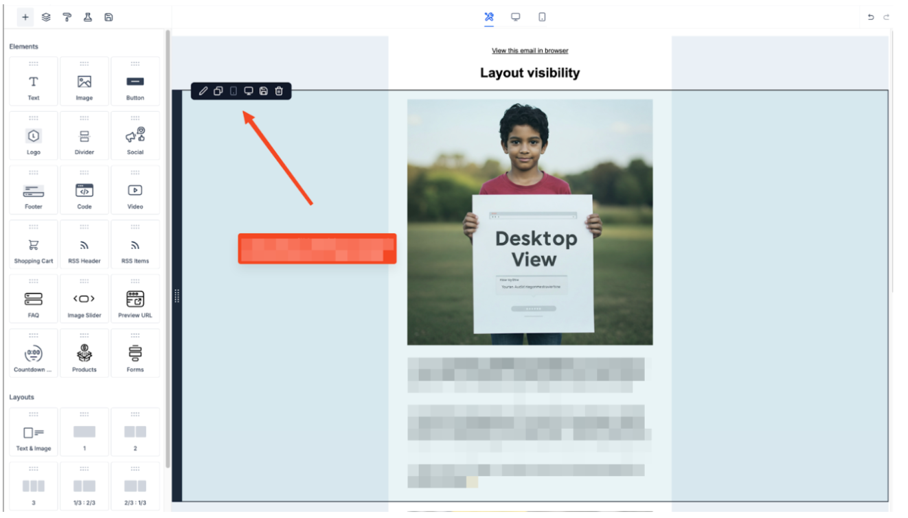 **How to Use:**While editing an email template, hover over a layout block and use the device icons to toggle visibility. Alternatively, use the “Visibility” tab in the left panel to manage preferences. Preview in both desktop and mobile views or send a test email to confirm the layout visibility.
