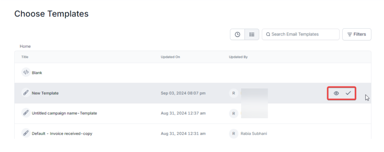 - Hover over the template, you will see two icons: the check mark icon (to select) and the preview icon.