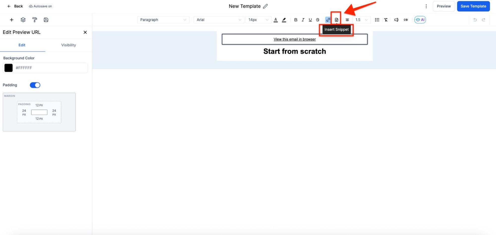 You can insert pre-saved snippets directly into your email templates or campaigns. Open any email editor, click “Insert Snippet,” and choose from your saved snippets. Note that attachments are supported in campaigns but not in templates.