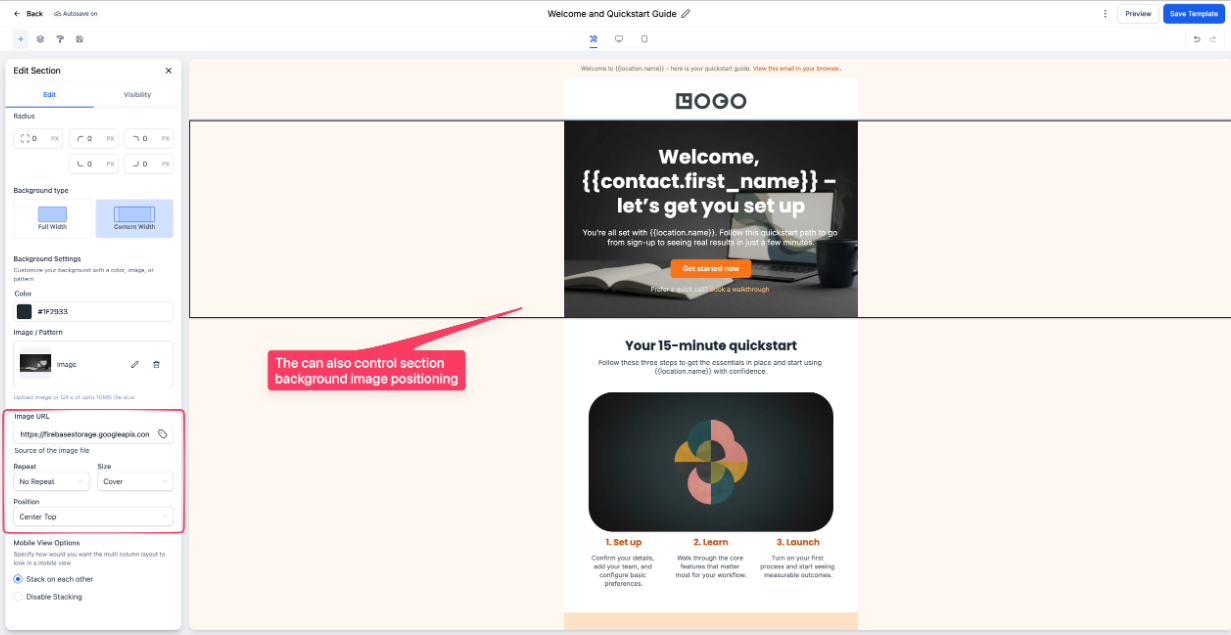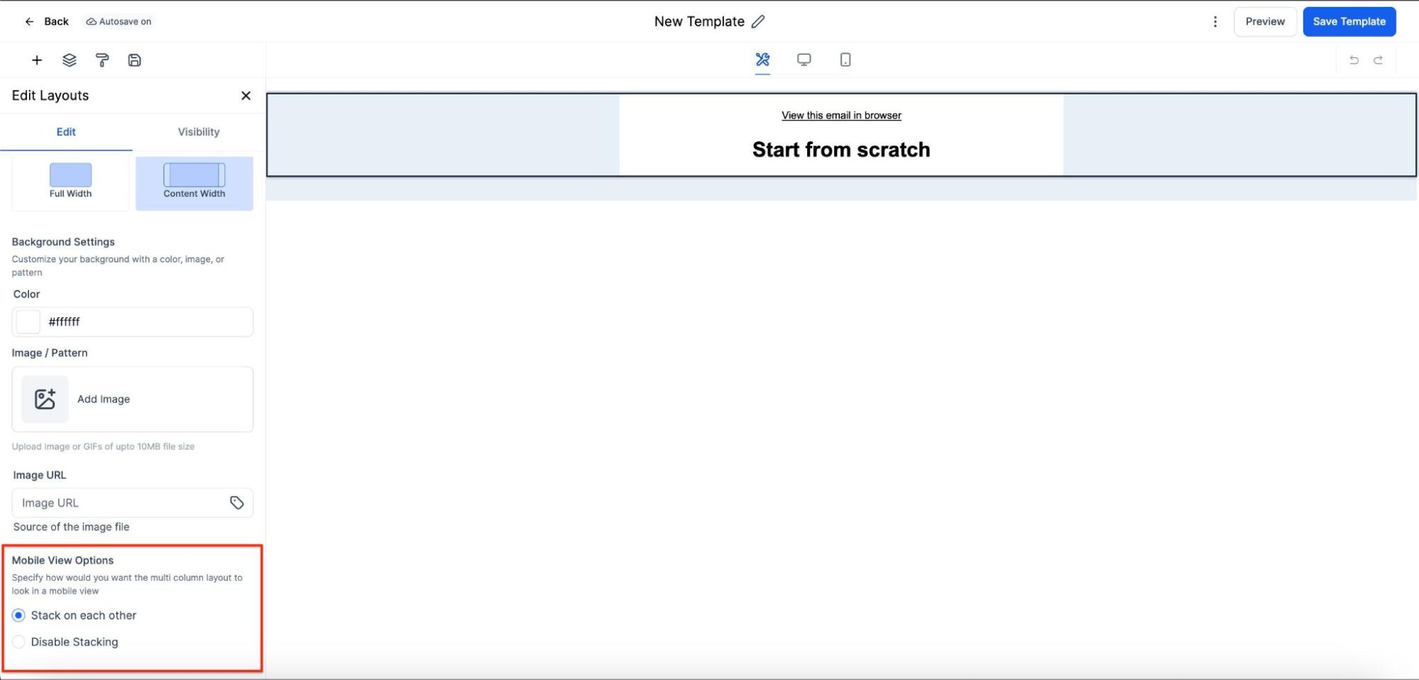 The Email Builder also supports better mobile optimization, allowing users to adjust how content displays on mobile screens. You can enable or disable stacking for two or more columns without needing custom code. Users can also adjust image alignment to ensure full-width images display correctly on mobile devices