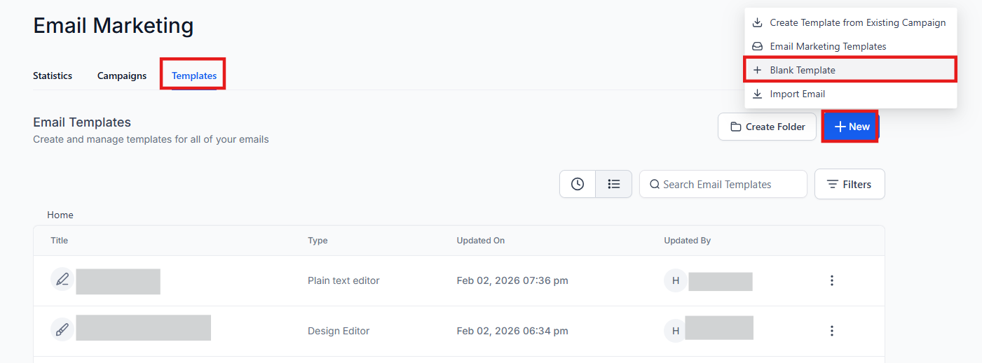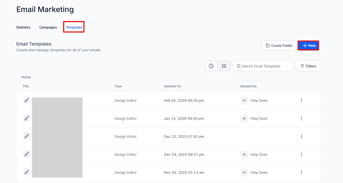 Navigate to Marketing on the left > Emails at the top > Select Templates and Click + New to create a new template.