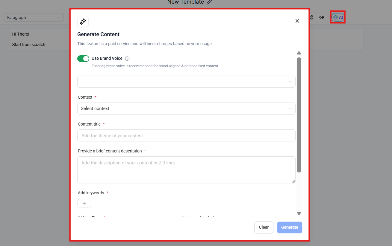 Question: How does the AI feature help with email templates? Answer: The AI tool can generate content suggestions, helping speed up email creation while maintaining quality and relevance.