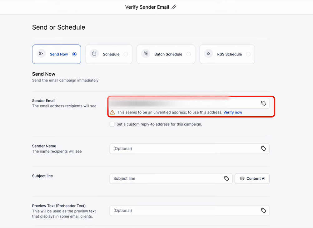Section titled “Step 8: Finish Scheduling Your Campaign”- Complete the rest of the campaign scheduling process, confident that your verified email address will improve deliverability.