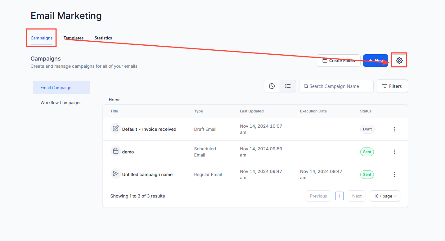 Section titled “Step 1: Start a New Campaign”- Navigate to Marketing on the left > Emails at the top > From the dropdown select Campaigns