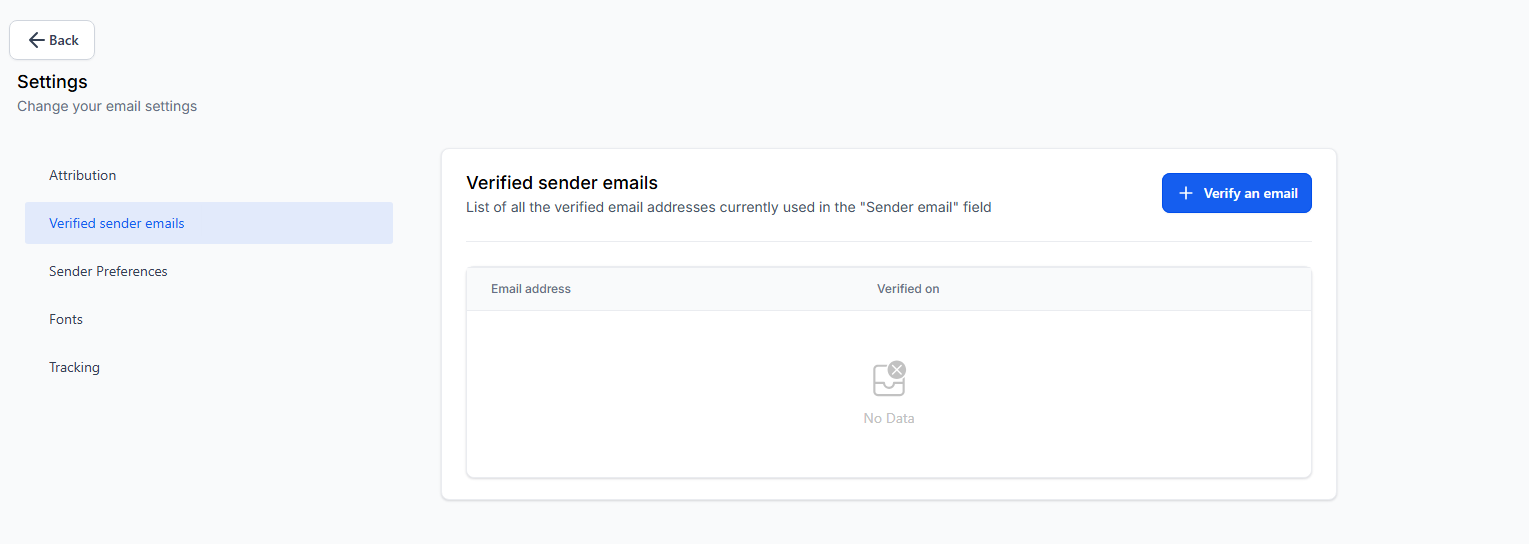 - Under the verified sender emails, select the option to send a verification email and follow the same process.