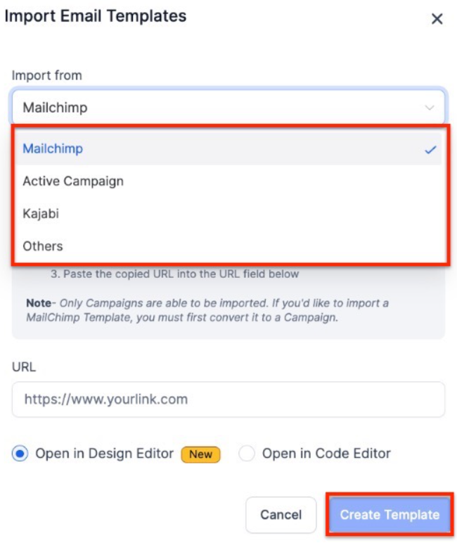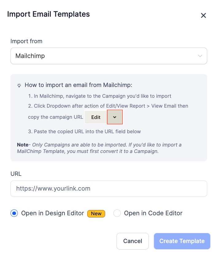 Question: How do I import a Mailchimp template into ? **Answer: To import a Mailchimp template, you must first convert it into a campaign in Mailchimp. Navigate to the campaign, click Edit/View Report > View Email, copy the campaign URL, and paste it in the URL field in under Emails > Email Templates > Import Email.