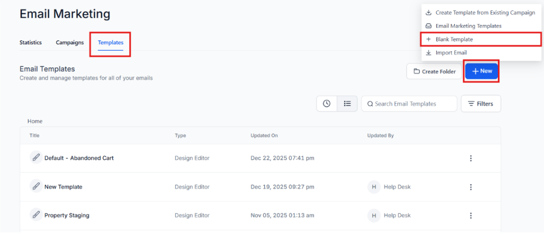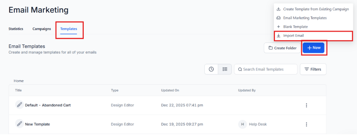 Section titled “2. Creating a New Email Template”- Click on + New to create a new email template.
