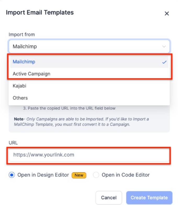 4. For Active Campaign and Mailchimp, copy and paste the URL for the campaign after selecting where the import comes from.