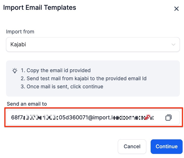 **Question: What is required to import an email template from Kajabi or other platforms? Answer: Copy the email address provided by your account and send a copy of the desired email from Kajabi or any other desired platform to this address. The system will automatically import the template into your account.