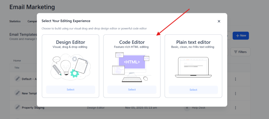 Section titled “Part 2: Importing HTML Email Templates”1. Navigating to the Email Builder