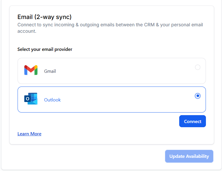 To use this email sync feature, simply connect your personal Outlook email to with 2-way sync. Emails will now only sync if they include at least one contact who is not a system user. Ensure your email settings are updated to take advantage of this improved functionality.