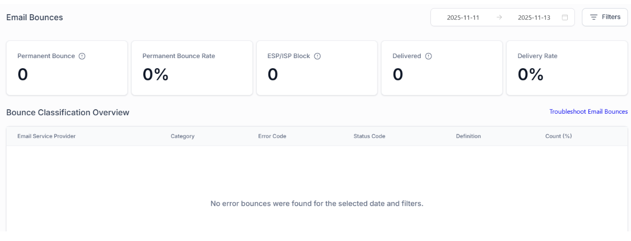 - Bounce Summary Overview: This feature provides detailed metrics on total permanent bounces, bounce rate, ESP/ISP blocks, and delivery rates, allowing you to assess email performance.