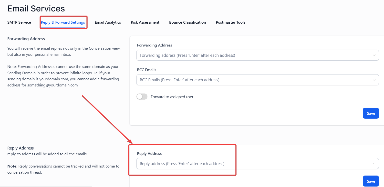 - Click on the Reply and Forward Settings tab within the Email Services section.
