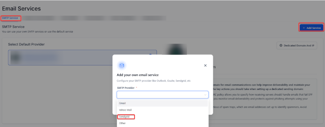 - In the popup, select SendGrid.