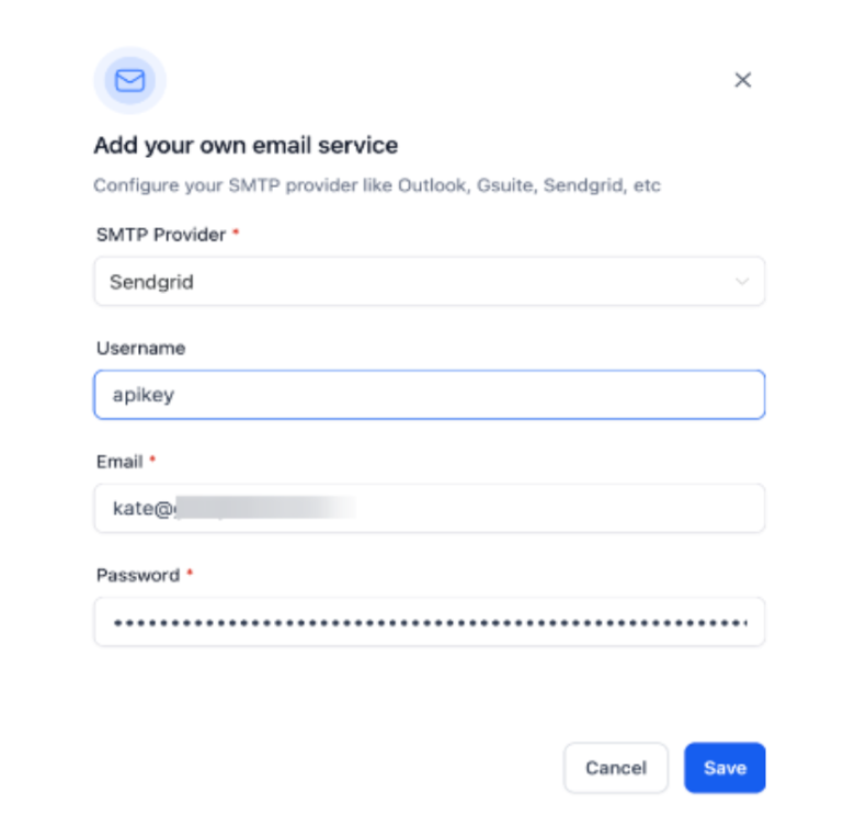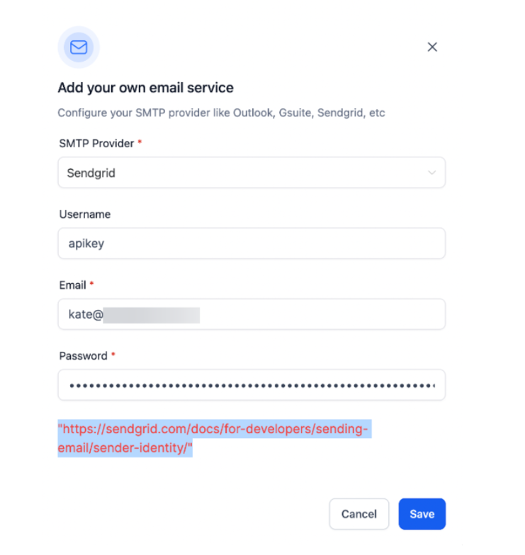 Question: Should I use my SendGrid account password in the password field? Answer: No. For the integration to work, you must paste the API Key you generated in Step 1 into the password field. Using your regular account password will result in an authentication error.