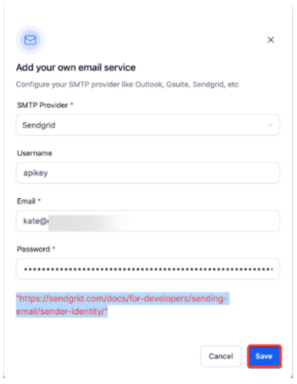 - For password paste the API you generated from your SendGrid account (in Step 1).