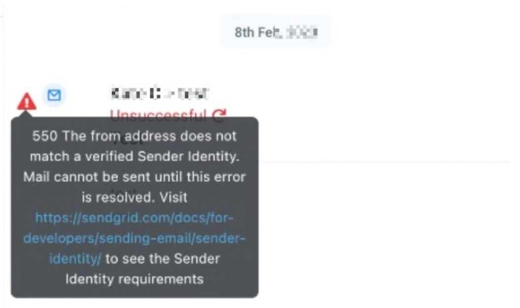 Section titled “Check for Specific Error Messages”If you encounter an error when sending a test email, click the warning icon in the conversation to view detailed error information. For example, an error message stating “550 The from address does not match a verified Sender Identity” indicates that your sender email must be verified.You can do this by either navigating to Contacts and selecting the contact with which you experienced this error or by navigating to Conversations.