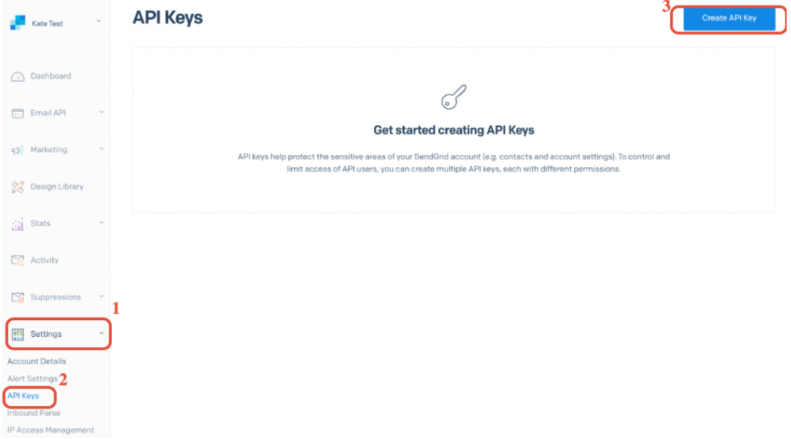 Section titled “Step 1: Create an API Key in SendGrid”- In your SendGrid account, create an API key with ‘Full Access’ under your SendGrid account settings > API Keys.