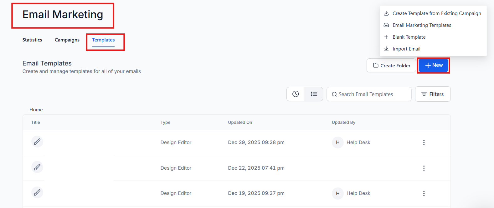 Section titled “How to Use the Email Builder and Its Inline Editor:”- Navigate to Marketing > Emails > Templates