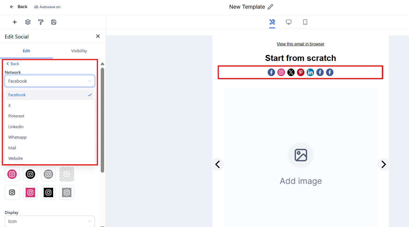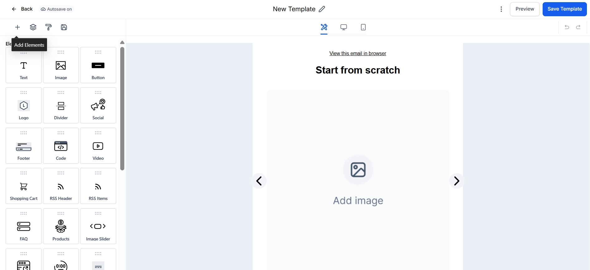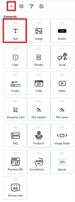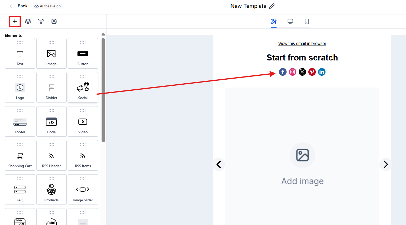 - The ‘Add Elements’ Icon: Introduces diverse content into the email, from text and images to complex structures such as Social, which you can use to display all of your social networks.