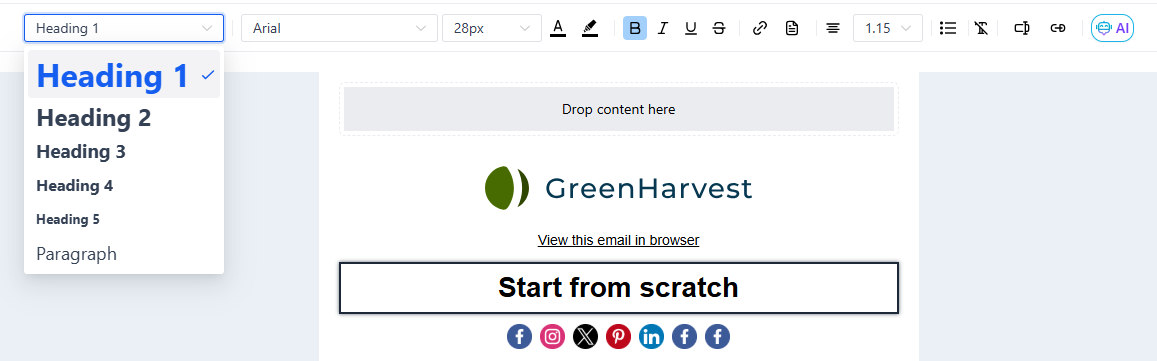 Section titled “Customization Features: Fonts, Text Sizes, Colors, Formatting, Hyperlinks, and More”The Inline Editor supports various customization features. Users can choose from multiple heading and paragraph formats, select supported fonts, adjust text sizes, and apply colors using hex codes for precise selection. Formatting options such as bold, italic, underline, and strikethrough, along with hyperlink integration, enhance the email’s visual appeal.